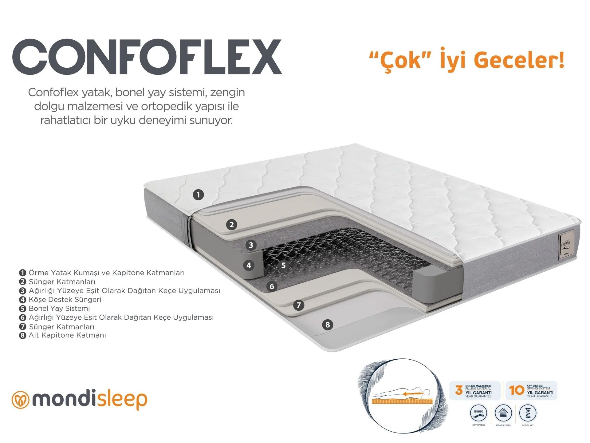 Confoflex yatak, bonel yay sistemi, zengin dolgu malzemesi ve ortopedik yapısı ile rahatlatıcı biri uyku deneyimi sunuyor.